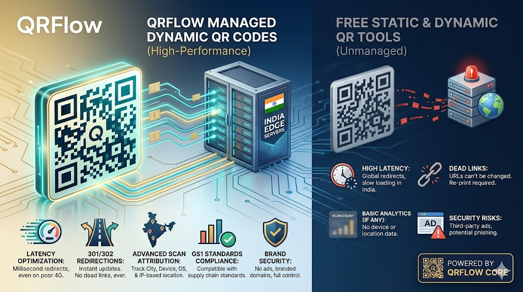 International competitors often host their redirection servers in North America or Europe, leading to high "Time to First Byte" (TTFB) in India. QRFlow is built for the Indian infrastructure.